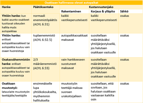 Taulukoissa 1 ja 2 on esitetty kiteytetysti Kiinteistöliiton tulkinta asunto-osakeyhtiölaista.