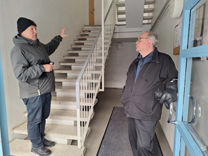 Keskustelun päätteeksi tehtiin kierros niihin taloihin, joihin hissin jälkiasennusta alustavasti suunnitellaan. Kohteen rakennuspiirustuksiin Merilä ja Vesterinen olivat tutustuneet jo ennakkoon.